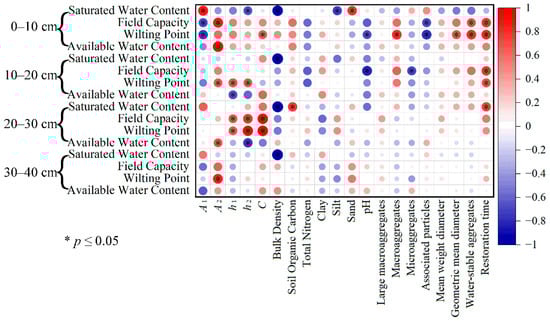 Relationships between soil hydraulic properties and associated physicochemical parameters were statistically evaluated through Pearson correlation analysis, with results visualized in the correlation matrix presented in Figure 7. For the surface soils, structural porosity (A1) showed significantly positive correlations with soil-saturated water content, and negative correlations with FC, WP, and AWC, while soil matrix porosity showed positive correlations with FC and AWC. There were strong and significant positive correlations between GWD, WSA and FC, WP, and AWC. This suggests that soil aggregate and porosity might be the main factors influencing soil hydraulic properties (e.g., soil field capacity, available water content, and hydraulic connectivity), which is consistent with previous studies from references [1,41]. However, the relationships between soil hydraulic properties and other parameters in 30–40 cm layers were weak (except for saturated water content vs. bulk density, and wilting point vs. matrix porosity).