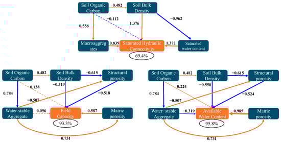 Path analysis of factors affecting soil hydraulic properties in surface soils. Numbers on arrows are normalized path coefficients (direct effect); orange arrows are positive, and blue arrows are negative; solid arrows indicate significant standardized path coefficients (p < 0.05), dotted arrows indicate non-significant standardized path coefficients (p > 0.05); the percentage near the circle indicates the variance R2 explained by the model.