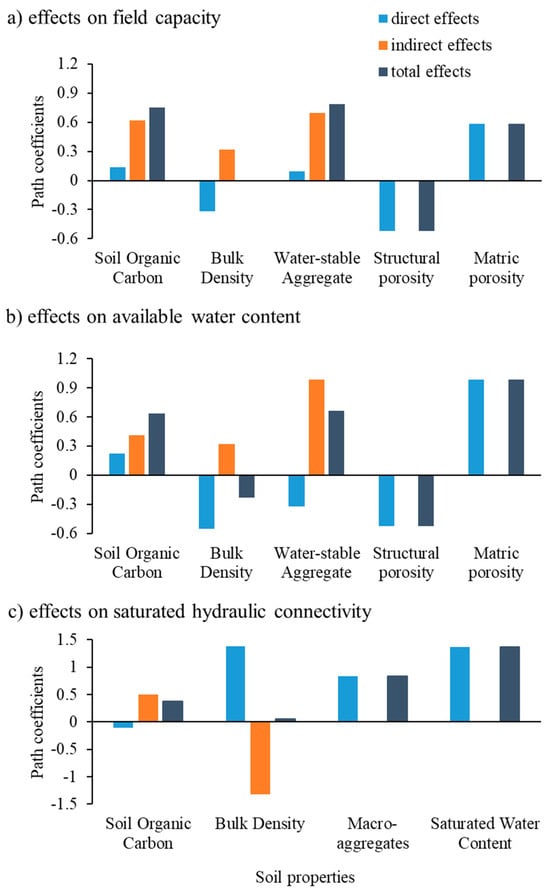 Direct and indirect effects of soil properties affecting soil field capacity, available water content, and saturated hydraulic connectivity in surface soils.