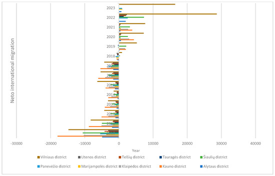 According to the data in Figure 1, the largest migration flows are observed in Vilnius and Kaunas municipalities. According to statistical data, between 2004 and 2016, on average, about 80% of the immigration flow was made up of Lithuanians returning from abroad and 20% of foreigners. In 2017–2022, this trend changed; in the aforementioned period, 50% of the immigration flow was made up of Lithuanians returning from abroad and 50% of foreigners, and from 2023, Lithuanians returning from abroad accounted for 25% and foreigners, 75% of all immigrants.