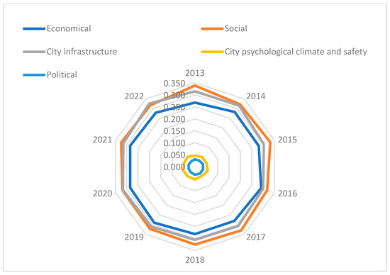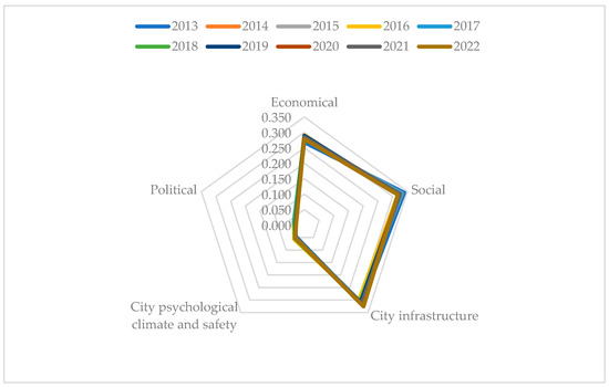 Based on Figure 2, the change in weight coefficients was observed in the period 2013–2022. In 2016, factors of economic and urban infrastructure had a similar weight, and the gap between economic and social factors was found to be the largest in 2013, 2017, and 2018. Analysing the total weight requirements for all years, it was observed that there are no cardinal differences between the groups of factors (see Figure 3).