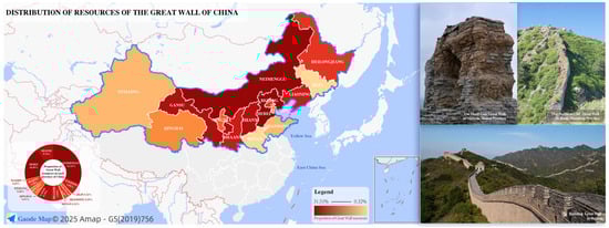 The Great Wall of China is among the first cultural heritage sites designated by the United Nations Educational, Scientific and Cultural Organization (UNESCO). Stretching over 21,000 km across 15 provinces, autonomous regions, and municipalities, it traverses diverse ecological landscapes, including deserts, plateaus, and agricultural regions. As it is the most extensive and widely distributed linear cultural heritage site in China, its preservation presents significantly greater challenges than those of individual heritage structures. (The distribution of Great Wall resources by provinces in China and the representative points is shown in Figure 1). Its unique geographical span, vast architectural scale, and profound cultural significance render it an irreplaceable component of global cultural heritage [4]. UNESCO describes the Great Wall as a “global heritage that transcends cultural boundaries”. Beyond serving as a symbol of Chinese civilization and social transformation, it is also recognized by the international community as a testament to human resilience and collective endeavor, embodying both historical legacy and cultural symbolism.