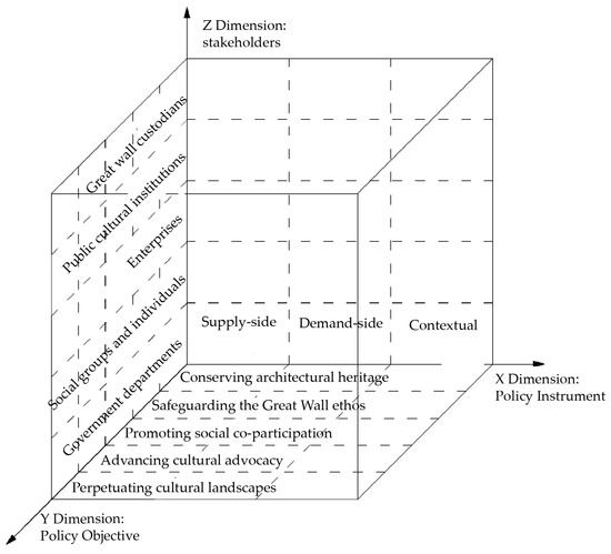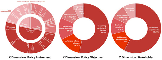 Firstly, government departments: various governmental bodies at all levels are responsible for deploying and implementing the GWCP policies. Secondly, social groups and individuals: individuals who provide support for the cultural preservation of the Great Wall. A third layer involves enterprises: business entities engaged in activities related to the Great Wall’s cultural heritage. Fourth in sequence, public cultural institutions: non-profit organizations focused on the preservation of the Great Wall’s culture. Finally, Great Wall custodians: individuals, including protectors and volunteers, employed by county-level local governments or relevant departments to patrol and protect the Great Wall. The X-Y-Z three-dimensional analysis framework for the text of GWCP is shown in Figure 2.