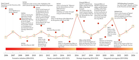 Since the “Great Wall Protection Regulations”, promulgated in 2006, are the first laws targeting Great Wall protection and outline the legal responsibilities of various levels of government and departments, which have significantly guided the formulation of subsequent policies, the search period was set to conclude by 31 December 2024, with the time span for the policy documents being from 2006 to 2024 [43]. After coding and screening, a total of 73 valid policy documents were finalized. These included one document from the National People’s Congress and its Standing Committee, six documents from the central government (the Central Committee of the Communist Party of China and the State Council), and 66 documents from other ministries and departments, such as the NCHA, including the Regulations on the Protection of the Great Wall (2006), the Great Wall Resource Survey Manual (2007), the Guidelines on the “Four” Work of the Great Wall (2014), the Guidelines on the Protection and Maintenance Work of the Great Wall (2014), the Great Wall of China Protection Report (2016), issued by NCHA, the Great Wall Protection Master Plan, jointly (2019) issued by the MCT and NCHA, and the Typical Cases of Public Interest Litigation for Great Wall Protection Inspection (2023), issued by the Supreme People’s Procuratorate and NCHA. Representative policies, release dates, and trends are shown in Figure 3.