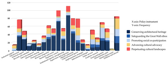 A total of 381 policy items were identified under the policy objective dimension. Among the five policy objectives, “conserving architectural heritage” was the most prevalent, accounting for 53.02% of the total. The distribution of encoded categories for GWCP policy objectives shown in Table 3. The objectives of “advancing cultural advocacy” (14.70%), “perpetuating cultural landscapes” (14.43%), and “promoting social co-participation” (10.76%) were relatively evenly distributed, while “safeguarding the Great Wall ethos” had the lowest representation at 7.09%. This distribution underscores the predominance of “conserving architectural heritage“, which aligns with the principles of scientific planning and original-state conservation, as well as the overarching objective of “protecting, inheriting, and utilizing the Great Wall effectively.” It also reflects China’s heritage conservation framework, which prioritizes “protection first, rescue as a priority, reasonable utilization, and enhanced management.” Additionally, “perpetuating cultural landscapes” remains a central objective of the government’s conservation strategy. Chinese policies have introduced sustainable development mechanisms to regulate tourism activities and ecological conservation in areas surrounding the Great Wall. However, similar to “advancing cultural advocacy” and “promoting social co-participation”, this area requires additional refinement of supporting policies and measures to enhance conservation efforts and expand stakeholder engagement. Moreover, in the “Great Wall Value” section of the Overall Plan for Great Wall Protection, the “value of embodying the resilient and indomitable spirit of the Chinese nation” is designated as the highest priority. Likewise, the China Great Wall Protection Report emphasizes that “preserving and promoting the Great Wall spirit has always been the fundamental purpose of Great Wall conservation”. However, the policy objective of “safeguarding the Great Wall ethos” has not been accorded the level of attention proportionate to its historical and cultural significance. This imbalance reveals a policy tendency favoring conservation over cultural transmission. This contradiction between “declarative importance” and “operational neglect” needs to be resolved urgently and, if not addressed, may weaken the role of the Great Wall in embodying both historical and contemporary national identity and hinder the sustainable development of GWCP [44]. For example, in 2016, the controversy over the repair of the Great Wall in Suizhong City, Liaoning Province: the Great Wall being “flattened” into a paved surface, although in line with the protection standards, was cut off the cultural perception, exposing the contradiction of “prioritizing engineering over interpretive integrity”.