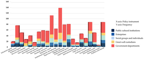 A cross-analysis of the “policy instrument–stakeholder” dimensions (Figure 5) reveals key trends in the distribution and application of policy instruments among different stakeholders. The five stakeholder groups exhibit distinct preferences in their use of policy instruments. Government departments were the most active stakeholders, with 681 instances of policy instrument usage, accounting for 56.10% of the total. Among policy stakeholders, government departments (51.25%) and Great Wall custodians (49.17%) exhibited the highest reliance on contextual policy instruments. This suggests that the government prioritizes establishing supportive regulatory and planning frameworks to advance GWCP. Social organizations and individuals, public cultural institutions, and enterprises responded most frequently to demand-side policy instruments. Specifically, public cultural institutions played an active role in public services and public education initiatives. Enterprises had the lowest level of policy instrument engagement, comprising just 8.73% of total instances, with their involvement primarily centered on social participation. This underscores the limited recognition of enterprises’ potential contributions within existing policies. There is a pressing need to foster greater corporate involvement in innovative conservation strategies and leverage their unique strengths to enhance the sustainability and effectiveness of GWCP.