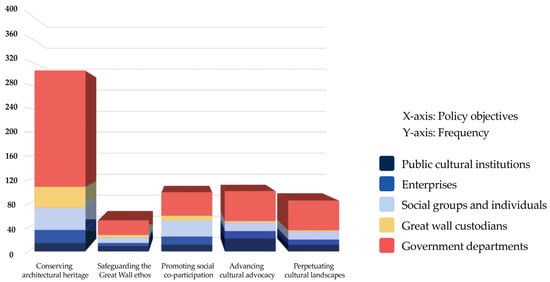 A cross-analysis of the “policy objective–stakeholder” dimensions (Figure 6) highlights significant variations in the participation levels of different stakeholders across policy objectives. As the dominant stakeholder group, government departments exhibited the highest rate of engagement across all five policy objectives, reinforcing their leading role in GWCP. However, their participation was heavily skewed toward the protection of Great Wall architectural heritage, accounting for 56.09% of their policy responses, whereas their engagement in “preserving and promoting the Great Wall spirit” was markedly lower, at just 6.96%. This suggests that government efforts are primarily directed toward the structural conservation of the Great Wall, with insufficient emphasis on its cultural and spiritual legacy. Similarly, other stakeholder groups also exhibited an uneven distribution of participation across different policy objectives. Their involvement underscores a strong emphasis on the protection of the Great Wall architectural heritage, while the transmission and promotion of the Great Wall spirit receive comparatively little attention.