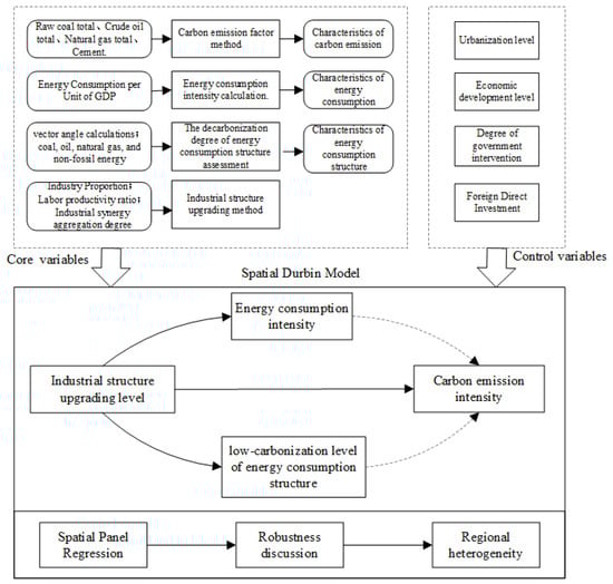 This study, based on the measurement of carbon emissions, energy utilization, and industrial upgrading, focuses on the design of key indicators and the construction of research models to examine the relationship between industrial upgrading, energy consumption, and carbon emissions. Based on the findings, it analyzes the spatiotemporal characteristics of carbon emissions, energy consumption, and energy transition in the YREB. It further explores impacts and underlying mechanisms of industrial upgrading on regional energy intensity, energy decarbonization, and carbon emissions. Additionally, it provides heterogeneity analysis and differentiated policy recommendations. Figure 1 provides a visual roadmap of the research framework.