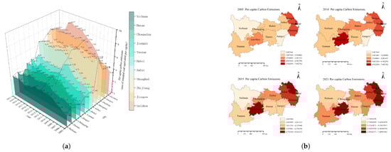 The per capita carbon emissions of the YREB’s 11 provinces. (a) Time trend. (b) Spatial trend.