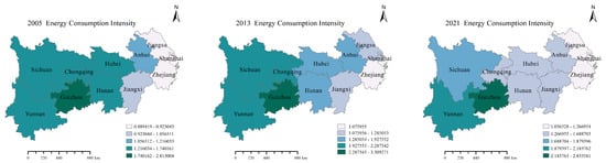 The energy consumption intensity of the YREB’s 11 provinces in 2005, 2013, 2021.
