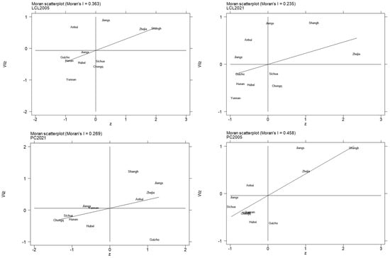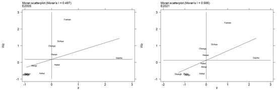 The spatial impact is clearer with geographic distance weighting. Figure 5 shows Moran’s I scatter plots based on geographical distance weights for the years 2005 and 2021. It can be observed that most provinces show clusters of both high and low values in energy intensity, low-carbonization level of energy consumption structure, and carbon emissions. Hence, employing spatial econometric models for the subsequent analysis is imperative.