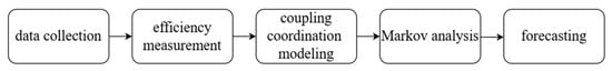 This study establishes a systematic research framework through the construction of a dual-system evaluation index system encompassing tourism efficiency and the economic development level. As illustrated in the research workflow (Figure 2), the methodology follows a structured approach: The initial stage involves formulating a multi-dimensional indicator system grounded in established theoretical principles. Subsequent steps include employing the Super-SBM model to quantify efficiency and applying the entropy weight method for objective index weighting. A coupling coordination degree model is then constructed to evaluate synergistic relationships between systems, followed by Markov chain analysis to uncover dynamic evolutionary patterns. The final phase integrates the GM(1,1) model under gray system theory to predict future coupling coordination states. By combining static assessment, dynamic evolution analysis, and predictive modeling, this methodology ensures both theoretical robustness and empirical validity.