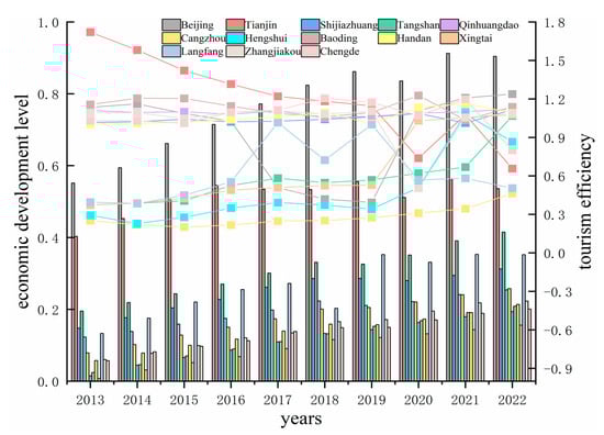 As shown in Figure 5, the level of coupled and coordinated development between tourism efficiency and the level of economic development in Beijing has always remained high. It improved from a good coordination status in 2013 to a quality coordination status in 2017, and despite a decline in coupling coordination in 2020 due to the impact of the new Crown Pneumonia outbreak, it remained at a quality coordination status and rebounded in 2021, showing an overall favorable development. The level of coupled coordination between tourism efficiency and the level of economic development in Tianjin was in the middle of the range from 2013 to 2022. It was in a state of primary coordination in most of the years, and although there was a decline in 2020 and 2022, the overall trend of optimization of the level of coupled coordination was still shown. The coupling coordination level between tourism efficiency and economic development level is generally low in 11 cities in Hebei Province, and all cities are in a state of dislocation, which indicates that the development and utilization of tourism resources in each city does not effectively promote regional economic development, and there is a particular gap between the two, with tourism efficiency generally lagging behind the level of economic development. Overall, the coupled coordination of tourism efficiency and economic development level is improving in 11 cities in Hebei Province between 2013 and 2022, with Shijiazhuang performing better, Hengshui performing averagely, and Shijiazhuang and Tangshan about to step into the coordinated ranks, while the other prefectural-level cities still have a lot of room for improvement.