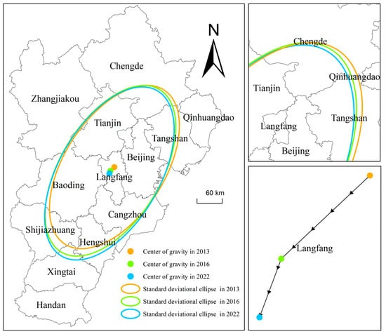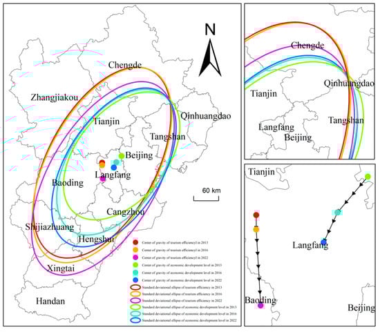 To deeply analyze the spatial pattern of tourism efficiency and its development dynamics in the BTH urban agglomeration, the tourism efficiency data in 2013, 2016, and 2022 were selected, and the standard deviation ellipse and center of gravity migration maps of tourism efficiency were plotted with the spatial statistical analysis tool of ArcGIS 10.8. Spatiotemporal analysis, as shown in Figure 4, reveals a distinct southward migration trajectory in the tourism efficiency centroid within the Beijing–Tianjin–Hebei urban agglomeration, transitioning from Langfang to Baoding during the 2013–2022 observational timeframe. The gradual expansion of the ellipse range and the shift in the center point coordinates to the southwest (from 116.28° E, 39.37° N in 2013 to 116.28° E, 39.32° N in 2016, and then to 116.26° E, 39.03° N in 2022) further reveal the changes in the spatial distribution of the tourism efficiency in the BTH urban agglomeration. The change in the angle of the ellipse decreases from 28.33° in 2013 to 28.29° in 2016. Then, it increases slightly to 30.16° in 2022, which indicates that the agglomeration of tourism efficiency in the direction of ‘north-east—south-west’ has increased.