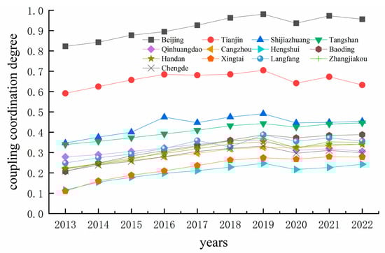 - The level of coupled coordination in the BTH city cluster in 2013–2022 develops in a more coordinated direction. However, in terms of spatial distribution, there are significant differences in the level of coupled coordination between the two systems in the cities in the BTH city cluster, with Beijing and Tianjin in a state of coordination, while the 11 cities in Hebei Province are in a state of dysfunction.