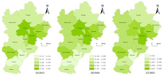 Temporal analysis of Figure 5 demonstrates sustained growth trajectories in both tourism efficiency and economic development level across the BTH megaregion from 2013 to 2022. Utilizing ArcGIS 10.8’s analytical toolkit, this investigation implemented Jenks natural breaks classification to generate comparative geospatial visualizations of inter-urban coordination patterns at triennial intervals (2013, 2016, 2022), as systematically presented in Figure 6. Overall, the BTH urban agglomerations differ significantly in space, with the northern region generally having a better degree of coupling coordination than the southern region, with Shijiazhuang, located in the south, developing more prominently, while the northern region is centered on Beijing and Tianjin. It can be seen from the figure that the spatial difference in the coupled development of tourism efficiency and economic development level in the BTH city cluster is gradually narrowing from 2013 to 2016 and then to 2022, which reflects the radiation-driven effect of Beijing and Tianjin on the neighboring cities. Beijing’s level of coupled and coordinated development has always been ahead of that of Tianjin and the prefecture-level cities in Hebei Province, while Tianjin’s level of coupled and coordinated development is second to Beijing’s, although its tourism efficiency is generally higher than that of Beijing’s, mainly because of the large gap between its level of economic development and that of Beijing.