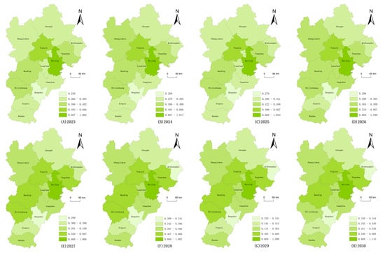 In this study, the predicted values of coupling coordination for the BTH city cluster for 2023–2030 were further spatially visualized using ArcGIS 10.8 software (Figure 8). Figure 8 shows that the coupling coordination degree of the BTH urban agglomeration maintains an overall growth trend. The spatial pattern changes from ‘Beijing is higher than peripheral cities’ in 2023 to ‘the central city is higher than the north and south cities’ in 2030, indicating that Beijing, as the regional center, has a significant pulling effect on the development of the peripheral cities and a substantial influence on the development of the peripheral cities. This indicates that Beijing, as a regional center, has a significant pulling effect on the development of the surrounding cities. Based on the BTH city cluster as a whole, the gap between the coupling coordination degree of Qinhuangdao City and other cities has widened in 2028, while the coupling coordination degree of Hengshui City has been at a low level for a long time. Although regional incoherence still exists in the BTH city cluster in 2023–2030, the coupling coherence gap between cities, except for Qinhuangdao City and Hengshui City, has significantly narrowed, and the overall tendency is to be balanced.