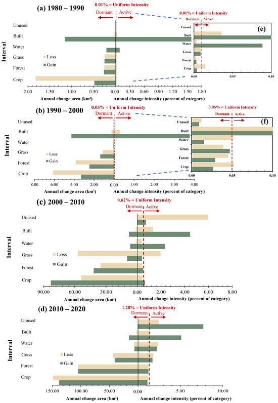 - Quan, B.; Pontius, R.G.; Song, H. Intensity Analysis to Communicate Land Change during Three Time Intervals in Two Regions of Quanzhou City, China. GISci. Remote Sens. 2020, 57, 21–36. [Google Scholar] [CrossRef]