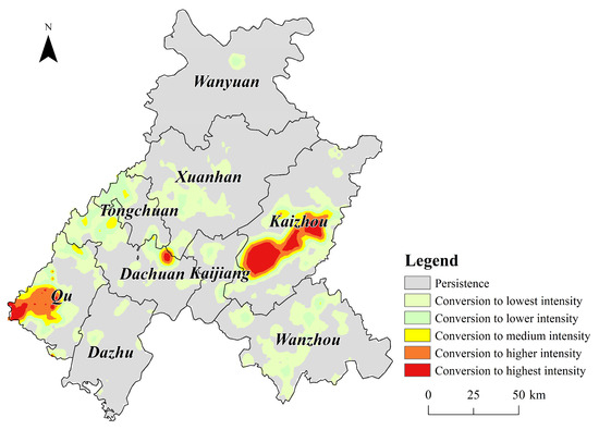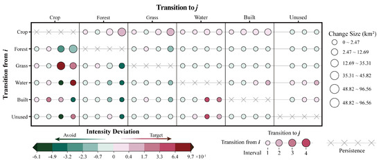 - Aldwaik, S.Z.; Pontius, R.G. Intensity Analysis to Unify Measurements of Size and Stationarity of Land Changes by Interval, Category, and Transition. Landsc. Urban Plan. 2012, 106, 103–114. [Google Scholar] [CrossRef]
