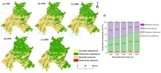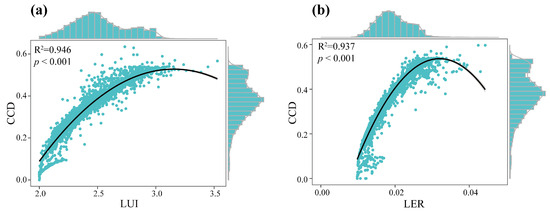- The CCD between LUI and LER predominantly manifested as moderately unbalanced and basically balanced types, characterized by strong coupling–weak coordination states. The proportion of moderately unbalanced areas increased, while that of basically balanced areas decreased. Although some regions experienced improvements in their ecological environment, there was a notable deterioration in the central area of Kaizhou, as well as in the urban sections of Qu and its hilly western portions.