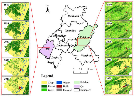 - After 2000, rapid agricultural development in Qu County converted southwestern hilly areas into cropland. In Kaizhou, cropland development in the middle reaches of the Nanjiang River resulted in a significant reduction in forestland and grassland. These phenomena cause topsoil loss and may affect regional biodiversity and ecosystem integrity through food chain disruptions [69].
