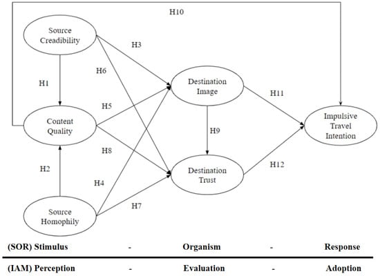 The Stimulus–Organism–Response (SOR) theory and the Information Adoption Model (IAM) are pivotal theoretical frameworks in the fields of environmental psychology and information science. The SOR theory is extensively applied to examine how external information, such as the physical environment and multisensory tourism experiences, impacts tourists’ emotional responses and behaviors [17]. The IAM primarily explains how the source, quality, and credibility of information, along with its alignment with consumer needs, influence consumer decision-making [18]. Consequently, this study integrates the SOR theory and IAM to develop a comprehensive model, wherein source credibility, source homophily, and content quality act as stimuli; destination image and destination trust function as the organism; and impulsive travel intention is the response. From the perspective of source attributes, this study seeks to identify the factors that trigger impulsive travel intentions among potential tourists. Compared to existing research, the innovation of this study lies in several aspects. First, this is the inaugural study to merge the SOR theory and IAM within the context of social media, providing a theoretical framework for future research. Second, this study examines how source attributes influence impulsive travel intentions through a multilayered pathway of content quality, destination image, and trust, addressing the gaps in previous research that has treated these factors in isolation. The research objectives of this study are dual: (1) we theoretically advance the integration of the Stimulus–Organism–Response (SOR) framework and Information Adoption Model (IAM) within the contexts of social media; (2) the findings provide tourism marketers with practical guidance, assisting them in refining social media content strategies and source selection to develop more compelling travel content that resonates with target tourists.