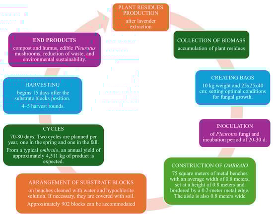 The figure emphasizes how a relatively low-complexity cultivation infrastructure (such as the ombraio) can support mushroom production from agro-industrial waste. It also represents graphically the potential of Pleurotus cultivation embedded in circular economy systems, converting lavender waste into high-value food and soil amendments.