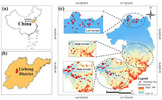 Study area consisting of the location of (a) Shandong Province in China, (b) the Licheng District in Shandong Province, and (c) the sampling points in the Licheng District.