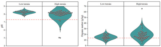 pH and organic matter contents in the farmland soils of low and high terrains. The red dashed line represents the background value.