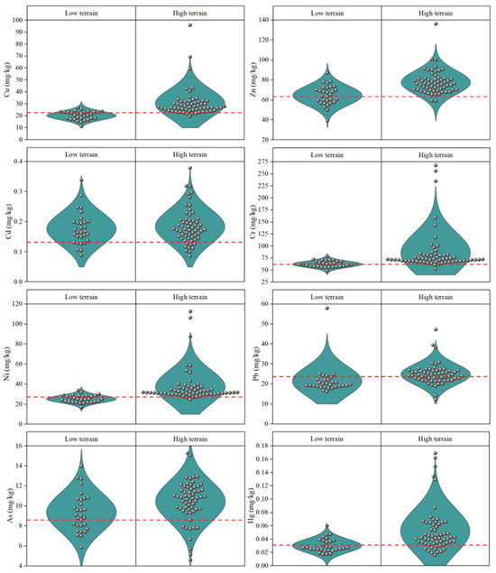 HM contents in the farmland soils of low and high terrains. The red dashed line represents the background value.