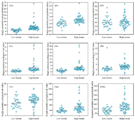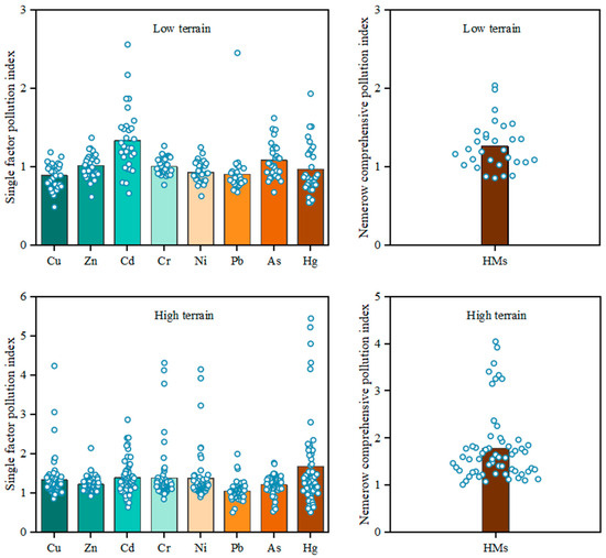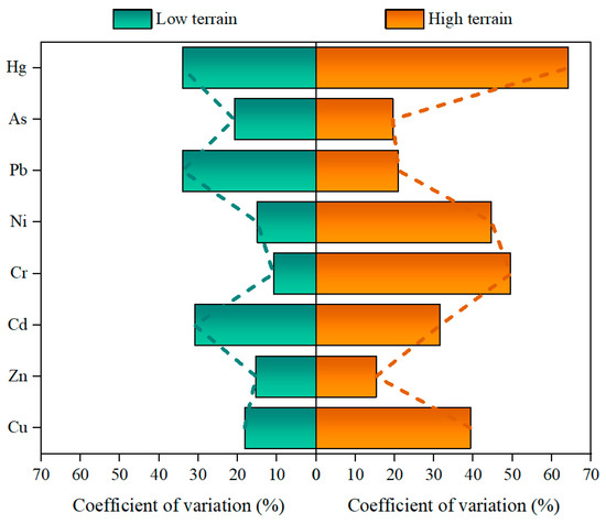 As shown in Figure 6, Cu, Zn, Cd, Cr, Ni, Pb, As, and Hg displayed coefficients of variation (CVs), respectively, of 18.16%, 15.34%, 30.92%, 10.82%, 14.95%, 33.97%, 20.75%, and 34.04% in the low-grade area. It was found that CVs lower than 16%, ranging from 16% to 36%, and exceeding 36% represented low, moderate, and high variations, respectively [43]. In this vein, Zn, Cr, and Ni exhibited low variations, while the remainder showed moderate variations. Compared to the rest, Zn, Cr, and Ni revealed relatively even scatters [44,45]. Aside from that, anthropogenic activities had little impact on those metals but were somewhat effective for the rest [46]. HMs found in high terrain were Cu, Zn, Cd, Cr, Ni, Pb, As, and Hg, which showed CVs of 39.31%, 15.27%, 31.54%, 49.52%, 44.62%, 20.96%, 19.59%, and 64.15%, respectively. Given this, high variations occurred in Cu, Cr, Ni, and Hg, indicative of the intense anthropogenic influence on these [47]. Meanwhile, anthropogenic activities affected Cd, Pb, and As pollution to some extent, as evidenced by their moderate variations in these metals. It was also noteworthy that only Zn displayed low variation in the area where anthropogenic interference on the metal was minimal.