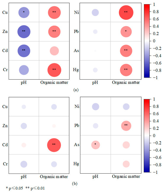 Pearson correlations for pH, organic matter, and HMs in the (a) low- and (b) high-terrain soils.
