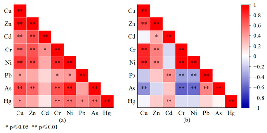 The normality and homogeneity of variance were considered before Pearson’s correlation analysis was performed; the results of the normality and homogeneity of variance indicated that the data were suitable for Pearson’s correlation analysis. Pearson’s correlation analysis provides insight into the strength and direction of linear relationships between two variables. As demonstrated by Pearson’s correlations, Cu showed positive correlations with the remaining HMs in the low-lying area (Figure 7a). Furthermore, there were strong positive correlations between Zn and Cd, Cr, Ni, and As. As for Cr, Ni, Pb, As, and Hg, only the correlation of Cr with Cd was significantly positive. However, Ni, Pb, As, and Hg were positive in correlation with Cr. Also, Pb, As, and Hg displayed positive correlations in addition to As and Pb. Therefore, HMs with positive correlation owned homologous sources in the area [49]. In the high-lying region, positive correlations existed between Cu and Zn, Cr, and Ni, whereas a negative correlation occurred between Cu and As (Figure 7b). A previous case verified that the negative correlation indicated divergent origins of HMs [50]. As a result, Cu showed similar sources to Zn, Cr, and Ni but a different source to As. The positive correlations of Zn with Cd, Cr, and Ni and Cd with Pb and Hg indicated that the sources of HMs with an association were similar. Meanwhile, As and Pb produced a positive correlation, whereas Ni and Cr also appeared to correlate positively. The finding certified that As and Pb, as well as Ni and Cr, contained homology. Nevertheless, As and Pb exhibited negative connections with Cr and Ni, implying divergent sources of related HMs.