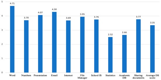 For the RQ1, descriptive statistics of digital skills per the entire sample completing this questionnaire (N = 22) (Figure 1) indicate that students’ greatest strengths in digital skills are in word processors (mean 4.71), email (mean 4.3), and presentation creators (mean 4.07). Their greatest skill gaps are in statistical analysis applications (mean 2.52) and academic DB searches (mean 2.66).