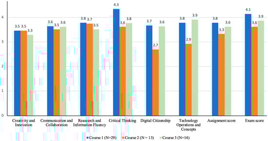 The means of digital competences measured in course assignments per each measured domain and the exam scores in each course are presented in Figure 2, and they indicate that in Course 1 students’ assignments showed higher levels of competences in all ICTE-MM fields than in the other two assignments, indicating that the students assignment scores in Course 1 which have a wider variety of ICT and non-ICT teaching tools are higher than scores in Course 2 where students had to rely mostly on the data sites provided in class and invest effort to search further independently for statistical data to produce a good assignment. Similarly, scores in Course 3 were superior to those in Course 2. In Course 3, independent research was needed aside from the course information, but required less statistical data and more policy-based information than in Course 2, which is easier to evaluate and use at this educational level than statistical data. These differences in the competences used for the assignments may also explain the lower DC and TOC mean scores and the higher RIF mean score in Course 2 compared to the other courses.