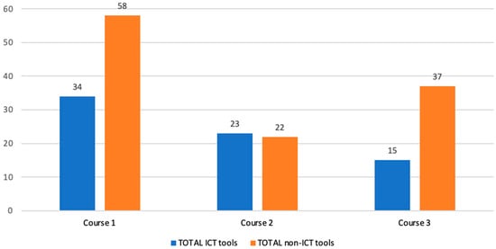 To address RQ3, using content analysis on the course feedback given after the oral examination, the frequency of occurrence of the methods used in teaching was recorded. Figure 3 shows the split between ICT and non-ICT tools used in teaching that were mentioned in the course feedback by students.