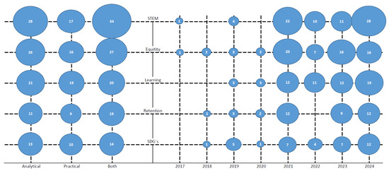 Recent studies underscore the necessity of acknowledging the unique qualities of each individual and incorporating internal dimensions—such as emotional well-being and personal motivation—into educational frameworks, areas traditionally overlooked in sustainability education [13]. Other studies have demonstrated that the use of active and inclusive methodologies, such as project-based learning, cooperative learning, and simulations, can foster the development of emotional intelligence and resilience, positively impacting the retention and performance of women in STEM [7,11]. However, a systematic framework analyzing the most effective pedagogical strategies for integrating these competencies into STEM education has yet to be established.