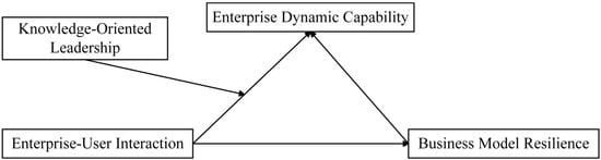 In fact, in today’s increasingly volatile business environment, enterprise–user interaction offers a new research perspective for enhancing business model resilience. In a rapidly changing market environment, valuable, scarce, inimitable, and non-substitutable resources constitute an important foundation for the formation of an enterprise’s dynamic capability [11,14]. Enterprise–user interaction, as an interaction behavior between an enterprise and its stakeholders, provides a favorable channel for the enterprise to acquire valuable and scarce resources. During the process of interacting with users, the enterprise can deeply excavate rich user-demand information and heterogeneous resources from the user’s perspective [18]. Moreover, in the continuous process of interaction, the enterprise can innovatively update and allocate its internal and external resources. It can continuously renew the value-creation logic of its business model, enhancing the adaptability and sustainability of the business model in the commercial environment. Furthermore, the formation of enterprise dynamic capability requires two major processes: resource identification and allocation [11]. However, in the actual business environment, due to the dual influence of environmental complexity and the enterprise’s actual goals, a large number of resources obtained through enterprise–user interaction may be difficult to efficiently allocate into valuable resources required for enhancing dynamic capability. In other words, only through efficient integration and allocation can the resources acquired from enterprise–user interaction contribute to improving enterprise dynamic capability and further strengthening business model resilience [9]. From the perspective of the planning view, enterprise dynamic capability is continuously accumulated under the strategic plans formulated by leaders [21]. The individual characteristics of leaders will, to a certain extent, affect the transformation process of enterprise resources, thus determining the evolution of the dynamic capability. Based on this, from the perspective of the leadership style, we introduce the moderating variable of knowledge-oriented leadership to explain the mechanism of enterprise integration and allocation of heterogeneous knowledge resources. Knowledge-oriented leaders attach importance to the role of knowledge in enterprise development and encourage employees to actively engage in knowledge learning and resource innovation [22,23]. Under this influence, the user resources obtained after enterprise–user interaction will be more efficiently allocated into valuable and unique resources. This promotes the renewal and reconstruction of the enterprise’s resource base, strengthens the positive impact of enterprise–user interaction on enterprise dynamic capability, and further enhances the indirect effect of enterprise–user interaction on business model resilience through enterprise dynamic capability.