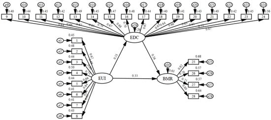 In addition, out of considerations for rigor, we adopted the mediating effect testing method proposed by Baron and Kenny (1986) to further clarify the mediating role of EDC [41]. The regression results are shown in Table 6. It can be seen that EUI has a significantly positive impact on BMR (β = 0.539, t = 11.040, p < 0.001), and EUI also has a significantly positive impact on EDC (β = 0.465, t = 9.059, p < 0.001). After controlling for EUI, EDC still has a significantly positive impact on BMR (β = 0.511, t = 10.979, p < 0.001). Meanwhile, the direct effect of EUI on BMR decreases but remains significant (β = 0.301, t = 6.469, p < 0.001). This result indicates that EDC plays a partial mediating role between EUI and BMR, with the mediating effect size being 0.238 (0.465 × 0.511), accounting for approximately 44.2% of the total effect. The results of the two mediating effect tests further support Hypothesis 2.