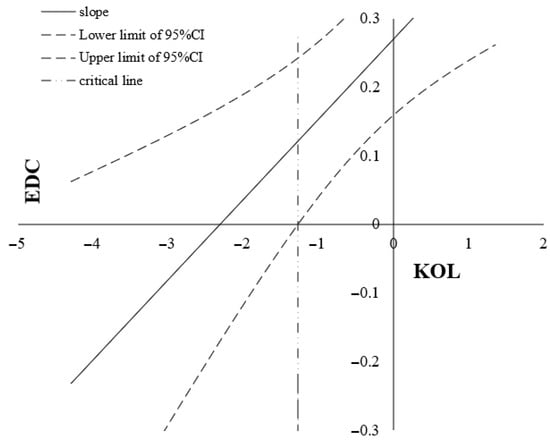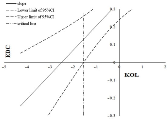 To further explain the moderated mediation effect, this study utilized the Johnson–Neyman plot to display the effects of knowledge-oriented leadership under different conditions and their significance levels. Figure 4 depicts that, when the value of knowledge-oriented leadership is to the right of the critical value of −1.281, both the upper and lower limits of the 95% confidence interval exclude 0, and the simple slope line remains consistently above the X axis. This indicates that knowledge-oriented leadership has a positive moderating effect. It moderates the indirect effect of enterprise–user interaction on business model resilience through enterprise dynamic capability. This finding further validates Hypothesis H4.