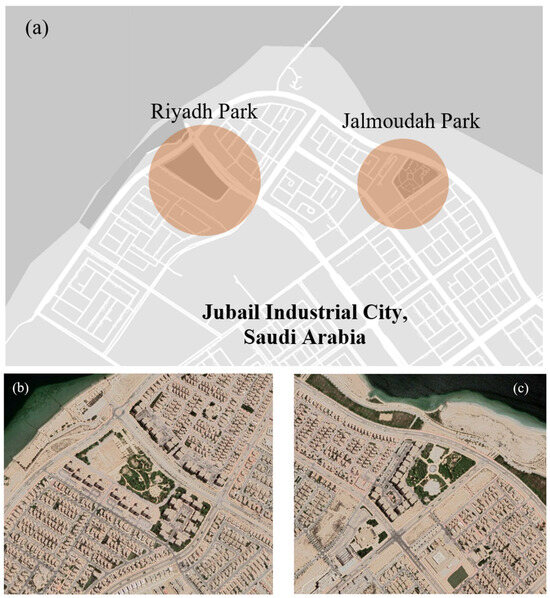 (a) Key plan of Jubail Industrial City, (b) satellite image of Riyadh Park, and (c) satellite image of Jalmoudah Park showing respective neighborhoods.