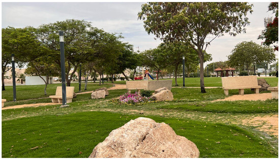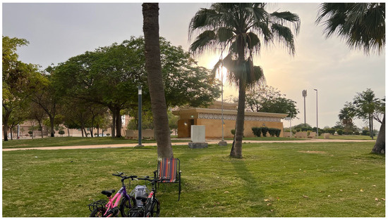 The study was conducted in Jubail Industrial City, Saudi Arabia. The zones and parks were selected at one of the city’s new districts called Jalmoudah. A sampling criteria technique was developed to select the sample location for the study which included the consideration of a modern and newly built area, the accommodation type near the area, and the ethnicity of the residents of the area. Jalmoudah is a newly built district in Jubail Industrial City and the selected parks are surrounded by different types of housing units comprising large and medium-sized villas, apartment complexes, and seafront locations, as shown in Figure 1a. Also, the residents of the area come from varying cultural backgrounds. The study included two parks: Riyadh Park, covering approximately 25,000 square meters, and Jalmoudah Park, spanning approximately 18,000 square meters. The satellite images of the parks are provided in Figure 1b,c showing their neighborhoods, as well as photos from both parks shown in Figure 2 and Figure 3.