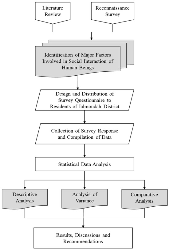 This study uses a mixed-method survey that was structured and assembled by the authors. It focuses on applying quantitative and qualitative techniques to assess the relationship between cultural background, social interaction, and improvement criteria by investigating the participant’s needs. Initially, an extensive literature review was performed, and a reconnaissance survey was conducted around various parks in the city to list the factors involved in the social interaction of human beings and to observe the basic trends and culture of people visiting the parks. Based on these details, a comprehensive questionnaire was designed to be distributed to the residents of the selected area. The complete steps followed for the achievement of objectives through this study are shown in Figure 4.