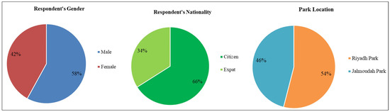 The survey (95 distributed, 83 responses) addressed research questions, revealing how park design, demographics, and perceptions influence social interaction. As mentioned earlier, two locations were selected for the survey, and 46 people responded from Riyadh Park, contributing to 54% of the total respondents. In contrast, this number is 46% for Jalmoudah Park with 37 respondents, as shown in Figure 5. The data obtained through the responses was compiled and analyzed in various aspects. The analysis included descriptive statistical analysis, analysis of variance, and comparative analysis. The demographic data of the respondents, as shown in Figure 5, shows that almost 65% of the respondents belonged to the age group of 30–45, which is a young and experienced class of educated people who have a good understanding of social norms and living standards. Of the respondents, 58% were male, whereas 42% were female. Also, 66% of them were Saudi citizens, whereas 34% were from other nationalities and were living as expatriates.