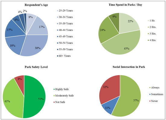 The data obtained for the other few questions, as shown in Figure 6, is put through descriptive analysis, and the results are shown in Table 3. Figure 6 shows that most of the people spend almost 2 h. in the park, and 51% of the people consider the park highly safe. A good number of people agreed that they visit the park for social interaction. The values mentioned in the response mean column are the average of the scale value opted by the respondents. For better clarification, the second column shows the interpreted average value of each parameter. The low values of standard deviation for these categories show that the difference in people’s opinion is less. Hence, the results can be considered sufficiently reliable and are eligible for further analysis.