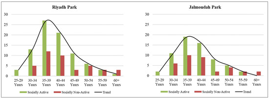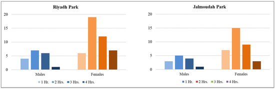 The bar charts shown in Figure 8 illustrate the distribution of participants by gender and time spent in each park. As clearly visible, females enjoy the green spaces more than the males. Most people spend at least 2 h a day in the parks. Furthermore, as per the collected data, females show a higher level of social interaction among each other as compared to males. The data shows that 75% of women agreed that they visit the park to meet new people or they come as a group of neighbors to enjoy some time with children during the daytime, whereas this value was found to be only 35% among males.