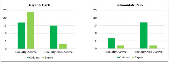 The graph shown in Figure 9 demonstrates the deviation of the social interaction level between parks and the nationality of the visitors. Although mixed results were found after the analysis, Riyadh Park has significantly increased social interaction levels for citizens and the expat population. In contrast, the citizens who were not socially interactive scored almost similar average numbers in both parks compared to the expats. This difference is found to be the reason for the basic facilities available in both parks. Riyadh Park is found to be ahead in development. That is why there is a bigger number of visitors in Riyadh Park as compared to Jalmoudah Park, as also visible in Figure 7.