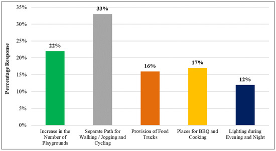 Regarding the opinion of the participants related to the required improvements in the parks, valuable data were collected as shown in Figure 10. Addressing research question 1, respondents spent about 2 h in parks, with Riyadh Park users reporting higher interaction due to playgrounds, BBQ areas, and tree cover (Table 3). A Q-Test confirmed strong relationships between amenities and interaction (Table 5). Respondents emphasized shaded areas in Riyadh Park for thermal comfort [6], supporting Hypothesis 1. Jalmoudah Park’s limited facilities correlated with lower engagement (Figure 10). Also, they opted for a similar option for children to have more playgrounds in the parks. Although a bit lower, the suggestion of adding food trucks, BBQ places, and improving the lighting during evening and night was also selected by the respondents. Notably, several respondents emphasized the need for more shaded areas provided by trees, which they associated with increased comfort during hot weather, particularly in Riyadh Park where tree cover was more extensive [6].