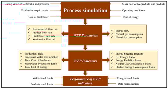 In the second stage, taking into account the information collected in the first stage, seven technical parameters are calculated. The product-related parameters are the product flow rate and the raw material flow rate. The water-related parameters are the freshwater flow rate and the wastewater flow rate, and the energy-related parameters are the total energy flow rate, the natural gas consumption, and the electricity consumption. Subsequently, in the third stage, ten technical indicators are calculated using the seven parameters mentioned above. Of these, one is associated with the product; it is called production yield (), it is measured in percentage, it indicates the product yield per unit of feed and it is calculated with Equation (1). Three of these technical indicators belong to water use. One of them is fractional water consumption (FWC), which is measured in m3/t; it represents the amount of water used to produce the product and is calculated with Equation (2). Another is the total cost of freshwater (TCF), which is measured in USD/day; it denotes the total price of freshwater consumed per unit of time, and it is calculated with Equation (3). And another is the wastewater production ratio (WPR), which is measured as a percentage; it indicates the relationship between the volume of freshwater needed for the process and the amount of wastewater generated and is calculated using Equation (4) [12].