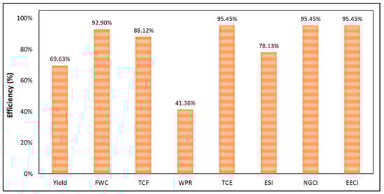 According to Figure 3, five of the eight indicators obtained an efficiency above 80%, which shows that the crude palm oil production process has very few deficiencies. The figure highlights that, for the technical indicators related to water, the fractional water consumption (FWC) presents an efficiency of 92.90% and the total cost of freshwater (TCF) has an efficiency of 88.12%, demonstrating an efficient use of water resources in the production of CPO. Additionally, three technical energy indicators—the total cost of energy (TCE), the natural gas consumption index (NGCI), and the electric energy consumption index (EECI)—obtained the highest efficiency (95.45%), because the predominant energy source in the process is natural gas. On the other hand, the production yield shows a lower efficiency, resulting in 69.63%; however, this result does not demonstrate a failure, because, being a single-product process, only the yield concerning the CPO is considered, without considering by-products such as palm rachis.